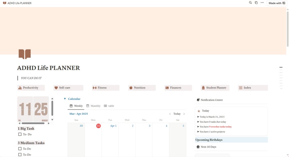 The ADHD Life Planner on Notion is designed to help you regain control of your day without the stress of complicated systems or unrealistic routines. Tailored specifically for ADHD moms, this comprehensive, interactive planner includes everything you need to stay productive, organized, and on top of your game — all in one place.